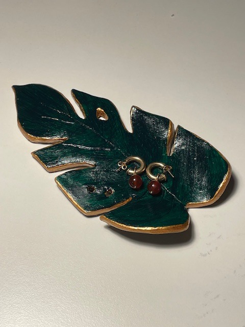 DAS:n airdry claysta valmistui peikonlehden lehti, jonka maalasin akryyliväreillä tumman vihreäksi ja lakkasin DAS:n kiiltävällä lakalla. Tämä lehti sai päälleen ihanimmat ja tärkeimmät korvakoruni.