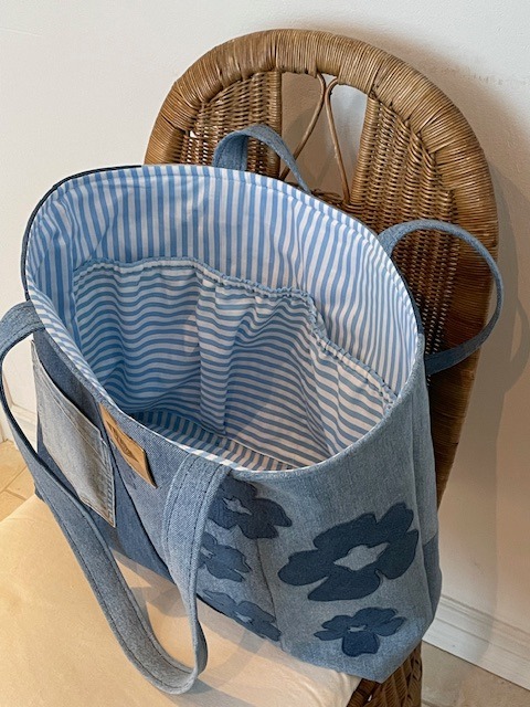 Tämä laukku on tehty vanhoista farkuista ja vuoritettu kierrätetyllä puuvillalla. Laukku on varsin reilun kokoinen ja tarkoitettu esim kauppakassiksi.