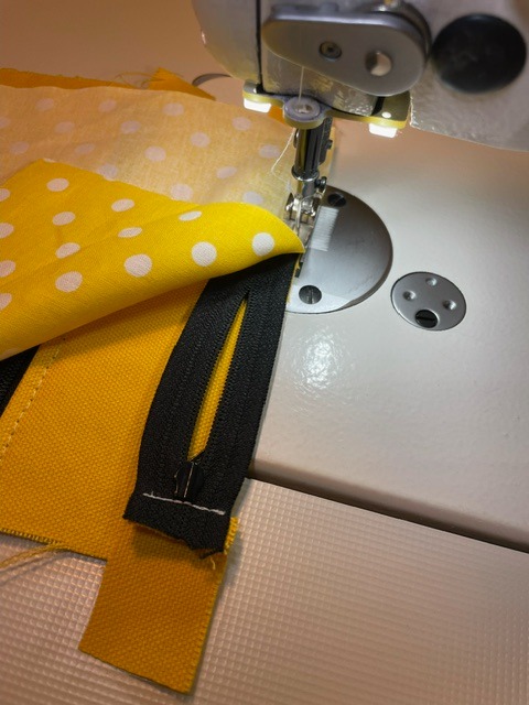 Leikkaa vetoketjut noin 14cm (taskuun) ja 15cm (yläreunaan) pitkiksi. Ompele vetoketjujen molempiin